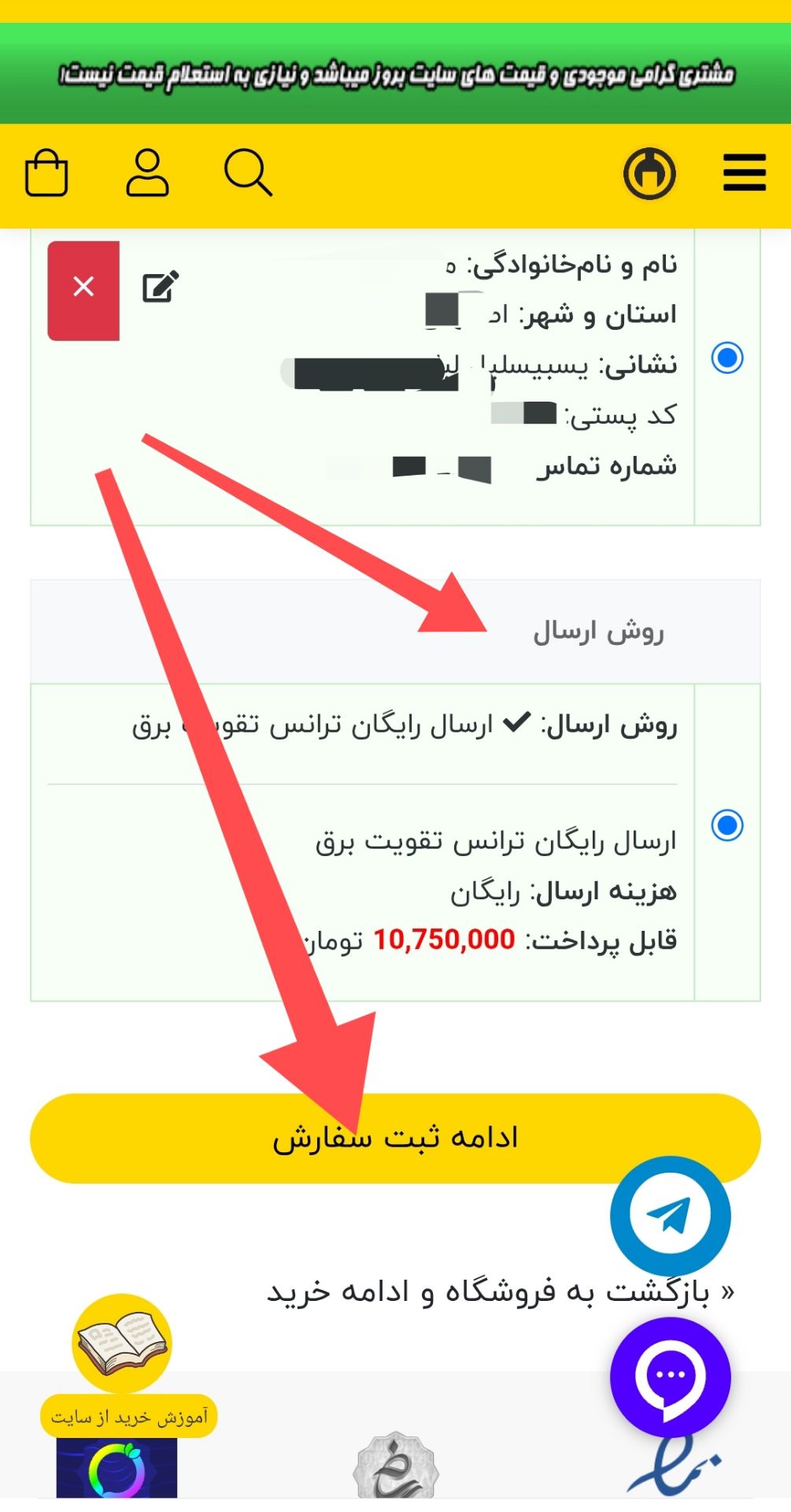 5- روش ارسال را انتخاب کنید و دکمه ادامه ثبت سفارش.